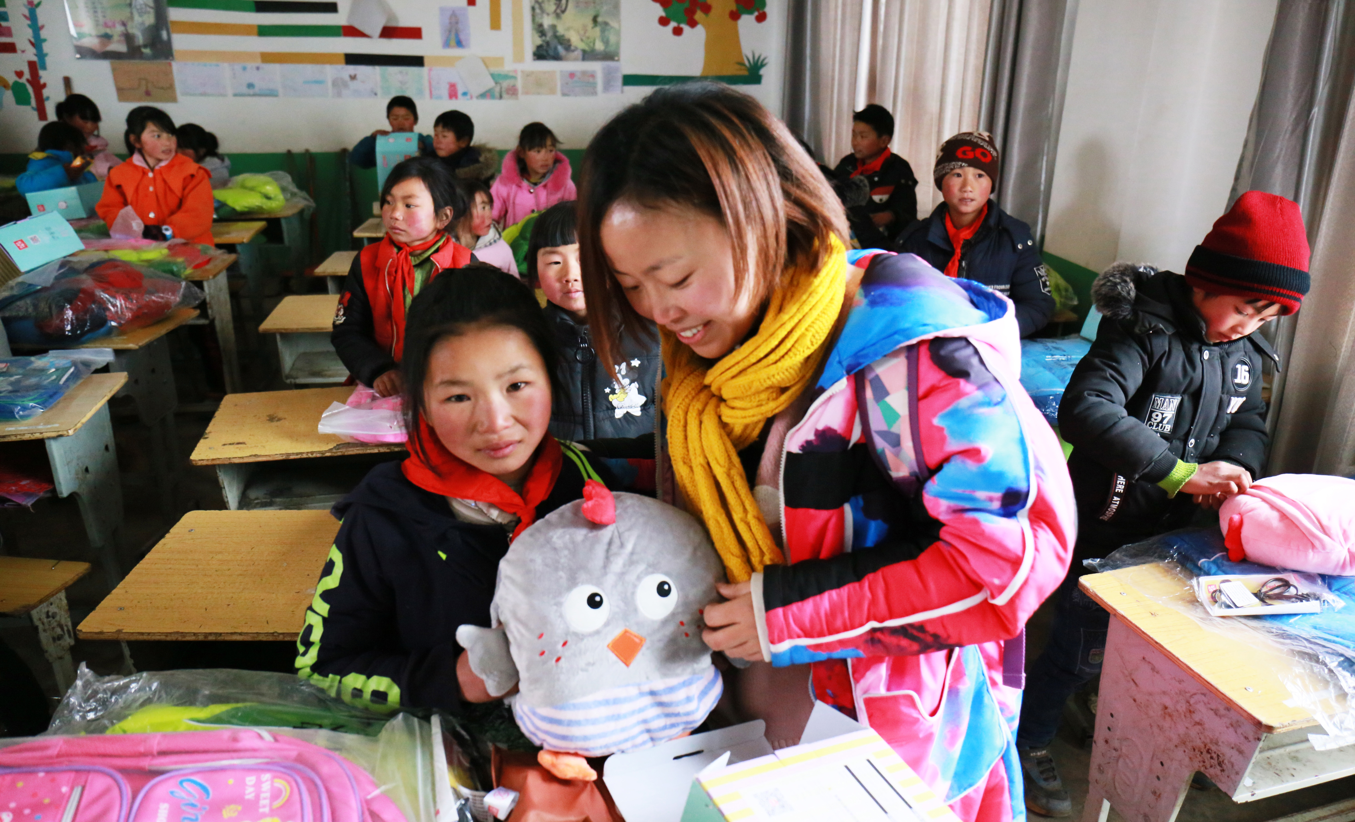 上圖均為志愿者為孩子們獻愛心,送上學習和取暖用品